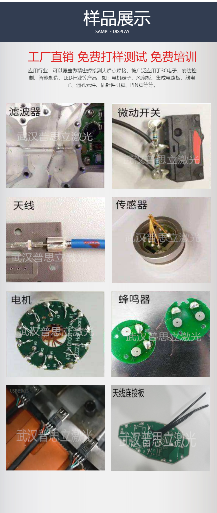 激光焊锡机的主要用途激光焊锡机可广泛运用于诊疗、国防、车辆电子产业,在传统式电烙铁焊接没法处理的行业,如超声波模具、焊接机器设备的溫度敏感度、自动化技术规定高层面具备更显著的优点。激光送丝焊接能够替代传统式的手工制作焊接,完成自动化生产。激光焊锡机的送丝焊接材料适用印刷线路板、FPCB板、接线端子排等点焊很大的商品;因为激光动能的可预测性更强,能够焊接传统式的高排热原材料。