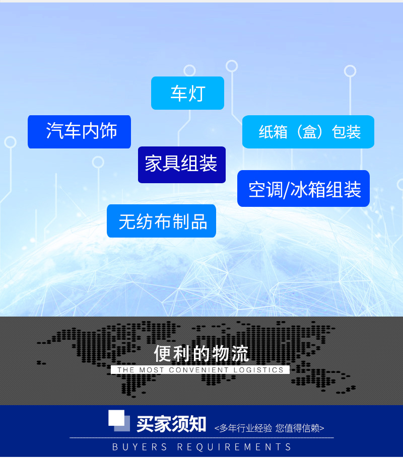 7、此喷枪被大量用在纸箱(盒)包装、车灯、汽车内饰、家具组装、空调/冰箱组装、无纺布制品等的生产。